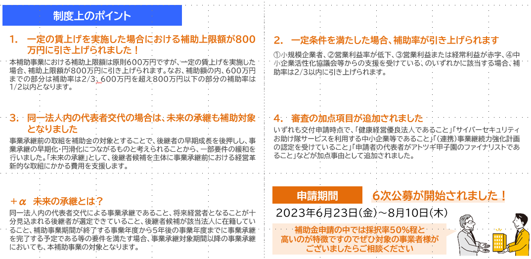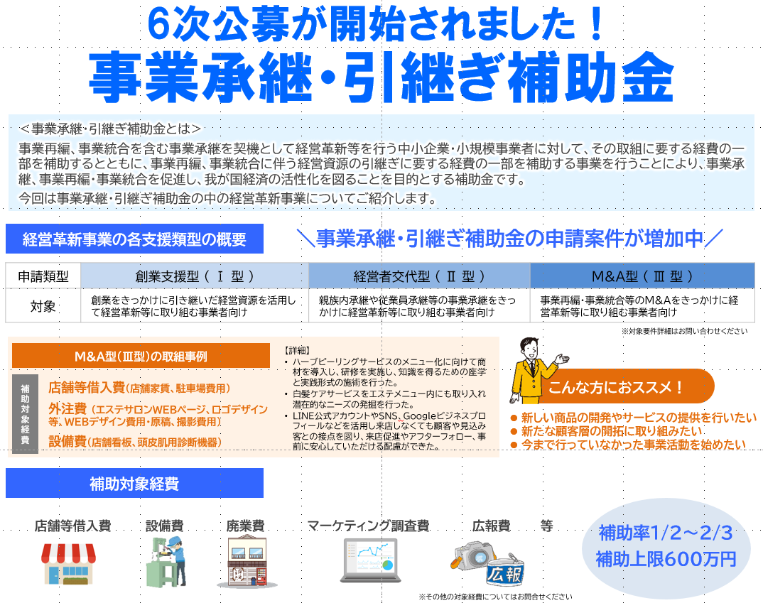 事業承継・ 引継ぎ補助金 6次公募が開始されました! 2023年7月7日 M&A事業承継補助金補助金 「6次公募が開始されました!事業承継・引継ぎ補助金」です。 ▼動画案内はこちら 視聴はこちらhttps://vimeo.com/839951446/9225f05427?share=copy 関連